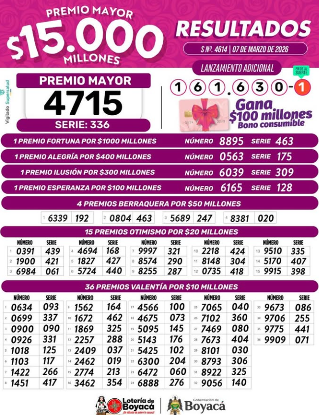La Lotería de Boyacá sorteó un premio mayor de 15 mil millones de pesos, el cual después de la debida deducción de ley queda en 9.960 millones de pesos que se entregan al ganador, si compró el billete completo.