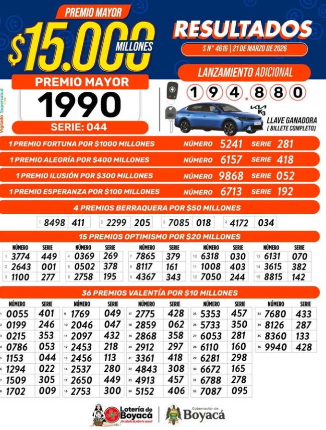 La Lotería de Boyacá sorteó un premio mayor de 15 mil millones de pesos, el cual después de la debida deducción de ley queda en 9.960 millones de pesos que se entregan al ganador, si compró el billete completo.