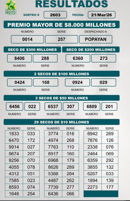Además, esta Lotería sortea 37 premios secos, que van desde los 300 millones de pesos hasta $ 10 millones (valores a los cuales se les aplica el 37% de deducción). Este es el resultado de la Lotería del Cauca con un Premio Mayor de 8.000 millones de pesos para el número 0014, de la serie 257: