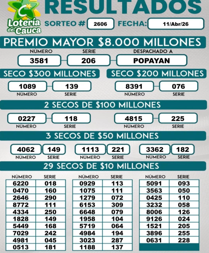 Este es el resultado de la Lotería del Cauca: Premio Mayor de 8.000 millones de pesos para el número 3581 de la serie 206 (Vendido en POPAYAN):