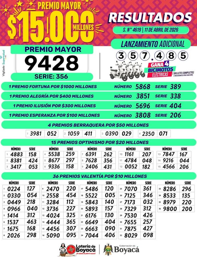 La Lotería de Boyacá sortea un premio mayor de 15 mil millones pesos, el cual después de la debida deducción de ley queda en 9.960 millones pesos que se entregan al ganador, si compró el billete completo.