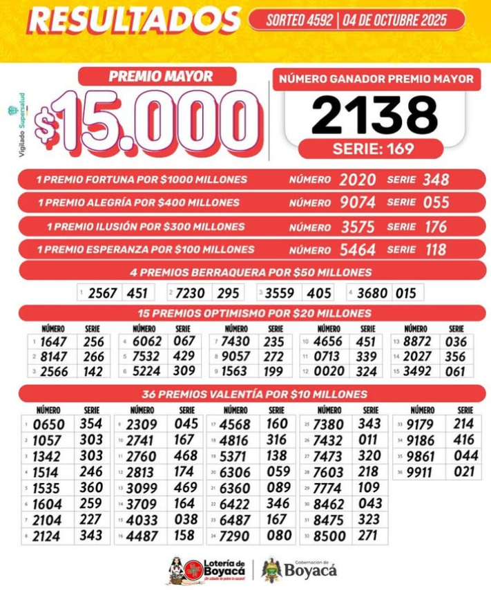La Lotería de Boyacá sortea un premio mayor de 15 mil millones pesos, el cual después de la debida deducción de ley queda en 9.960 millones pesos que se entregan al ganador, si compró el billete completo.