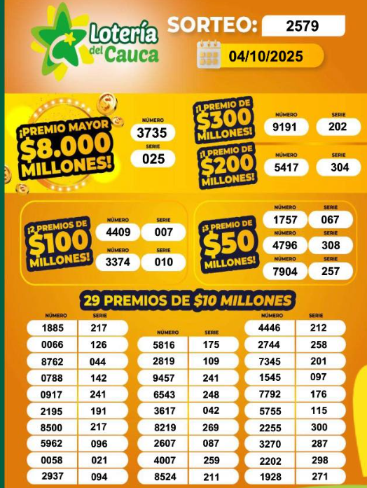 Además, esta Lotería sortea 37 premios secos, que van desde los 300 millones de pesos hasta $ 10 millones (valores a los cuales se les aplica el 37% de deducción). Este es el resultado de la Lotería del Cauca con un Premio Mayor de 8.000 millones de pesos para el número 3735 de la serie 025: