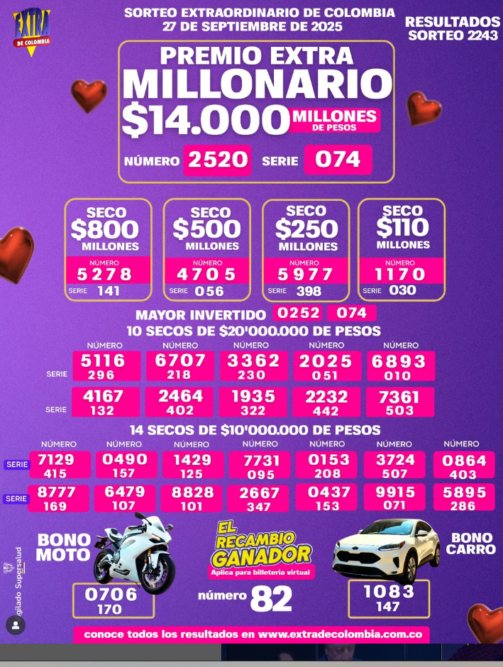 Y OJO al resultado del Extra de Colombia, el Baloto y demás loterías porque puede que sea Millonario hoy!!! Y aquí va el Extra de Colombia con un mayor de 14 mil millones de pesos.