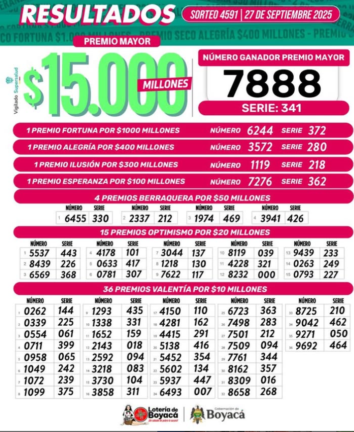 La Lotería de Boyacá sortea un premio mayor de 15 mil millones pesos, el cual después de la debida deducción de ley queda en 9.960 millones pesos que se entregan al ganador, si compró el billete completo.
