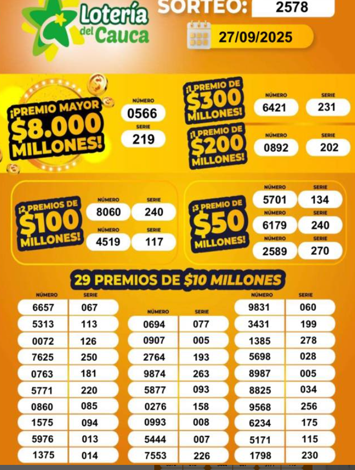 Este es el resultado de la Lotería del Cauca: Premio Mayor de 8.000 millones de pesos para el número 0566 de la serie 219: