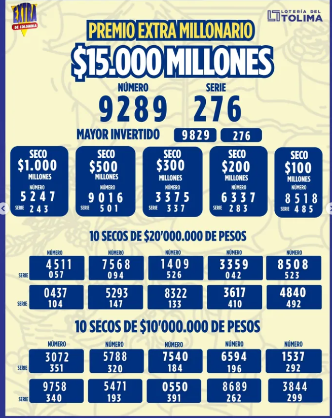 Además, OJO al resultado del Extra de Colombia, el Baloto y demás loterías porque puede que sea Millonario hoy!!! Y aquí va el Extra de Colombia con un mayor de 15 mil millones de pesos. (y en total 36 mil millones de pesos sumando todos sus premios secos y aproximaciones):