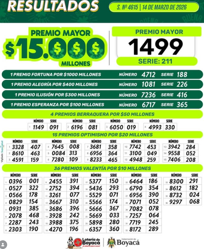 OJO al resultado del extra de Colombia, el Baloto y, además, le traemos el resultado de la Lotería de Boyacá, así mismo el resultado de la Lotería del Cauca y el paisita 3…como quien dice va a ganar más que un funcionario petrista.