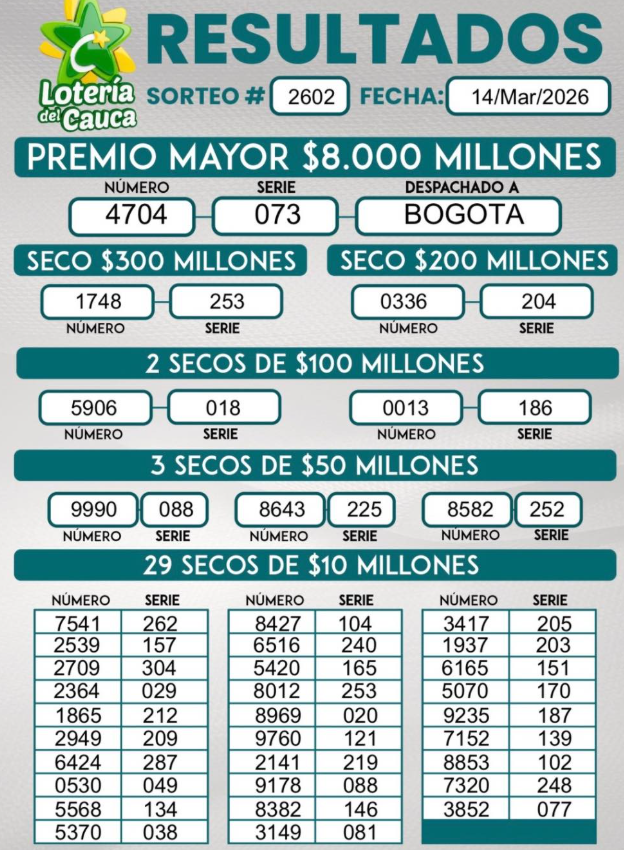 Este es el resultado de la Lotería del Cauca: Premio Mayor de 8.000 millones de pesos para el número 4704 de la serie 073:
