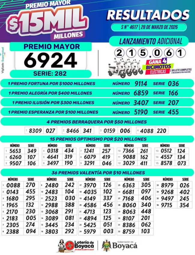 La Lotería de Boyacá sortea un premio mayor de 15 mil millones pesos, el cual después de la debida deducción de ley queda en 9.960 millones pesos que se entregan al ganador, si compró el billete completo.