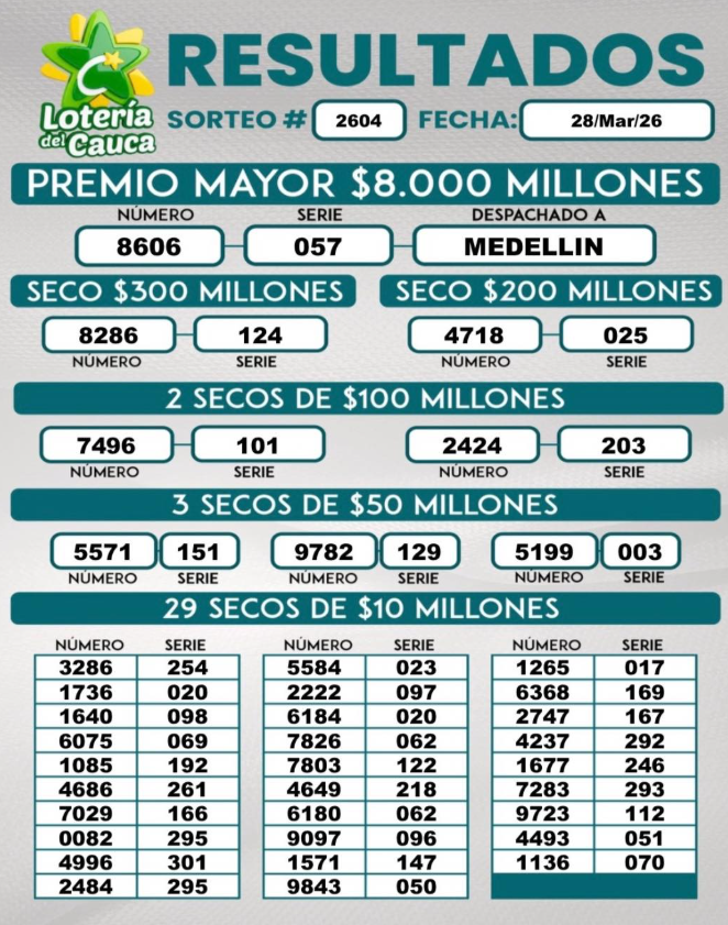 Este es el resultado de la Lotería del Cauca: Premio Mayor de 8.000 millones de pesos para el número 8606 de la serie 057 (Vendido en Medellín):