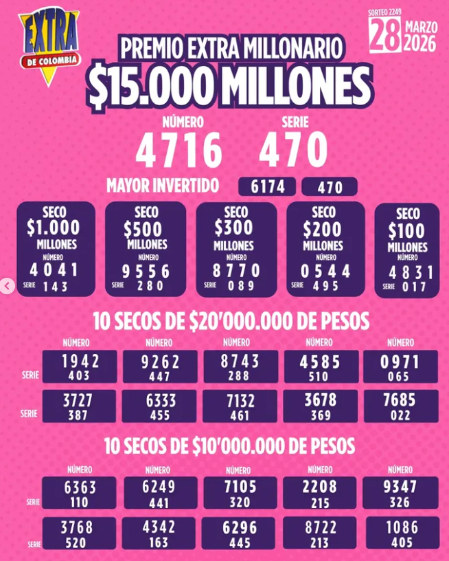 Además, OJO al resultado del Extra de Colombia, el Baloto y demás loterías porque puede que sea Millonario hoy!!! Y aquí va el Extra de Colombia con un mayor de 15 mil millones de pesos. (y en total 36 mil millones de pesos sumando todos sus premios secos y aproximaciones):