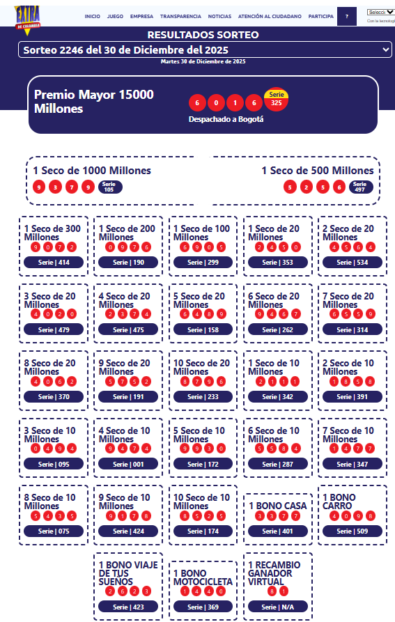 Y que mejor que cerrar el año 2025 que con el resultado del Sorteo Extraordinario de Colombia que este martes 30 de diciembre sorteó 15 mil millones de pesos de premio mayor ($ 15.000.000.000).