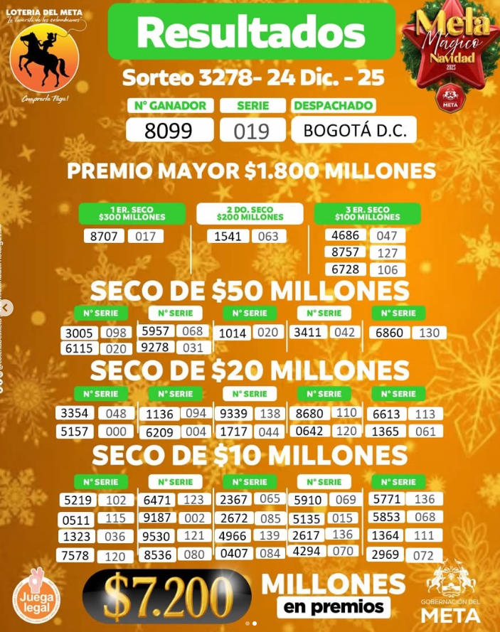 Y este resultado del Sorteo Extraordinario de Navidad, el Baloto y Loterías de Manizales, Valle y Meta en diciembre 24 de 2025 con rifa de más de 150 mil millones de pesos (sumados todos sus premios y aproximaciones).