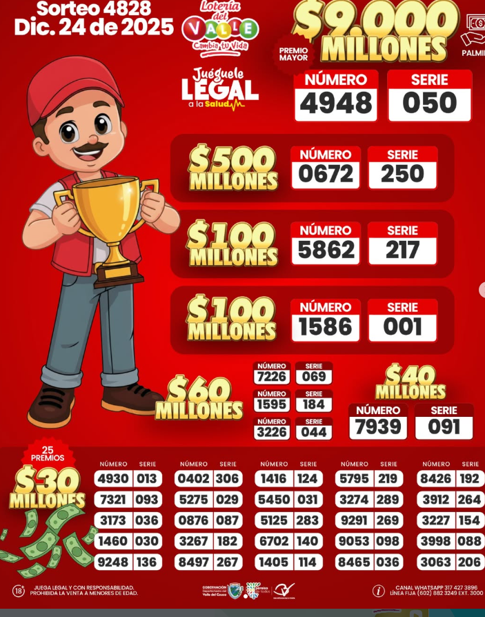 Revise…revise muy bien estos resultados de este miércoles 24 de DICIEMBRE del año 2025 de la Lotería del Valle: