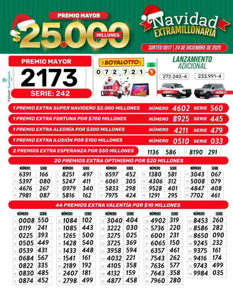 Aquí le traemos el Resultado del Sorteo Extraordinario de Navidad, el Baloto y Loterías de Manizales, Valle y Meta en diciembre 24 de 2025.