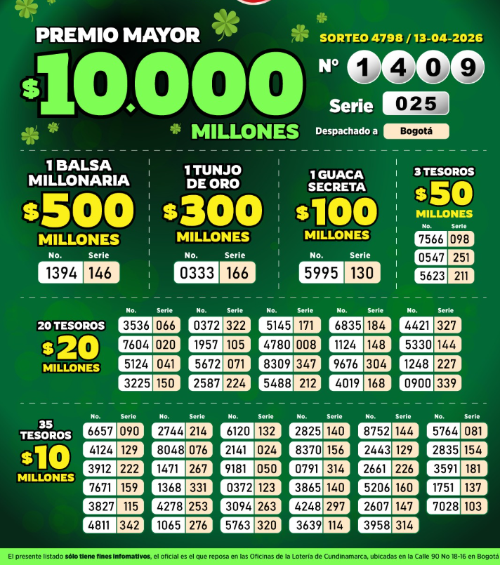 El NUEVO premio mayor fue de DIEZ MIL MILLONES de pesos ($10.000.000.000). Además, la Lotería de Cundinamarca entregó 54 premios secos millonarios, cuyos valores oscilan entre los 300 millones y los 20 millones de pesos. Si compraste tu billete, revisa muy bien el resultado: podrías ser uno de los afortunados ganadores: