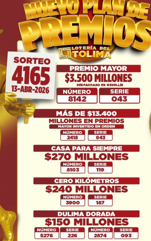 El premio mayor, de tres mil quinientos millones de pesos ($3.500.000.000), fue vendido en IBAGUÉ, así que los apostadores deben estar atentos. La del Tolima también sorteó 39 premios secos, incluyendo un bono de 270 millones para compra de vivienda y premios desde los 12 millones de pesos: