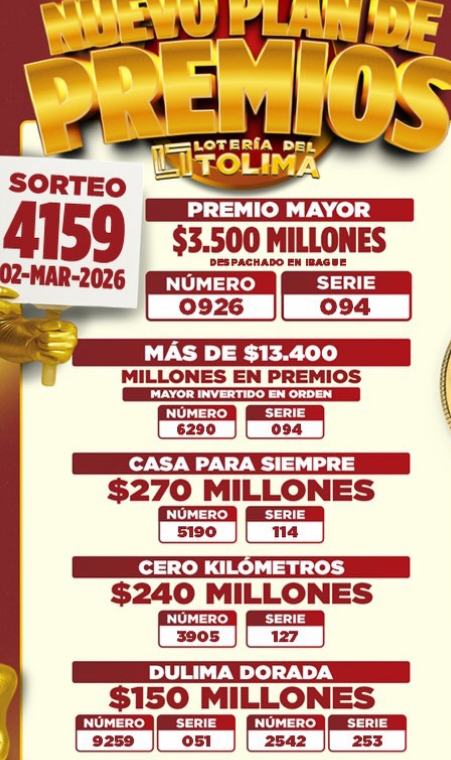 El premio mayor, de tres mil quinientos millones de pesos ($3.500.000.000), fue vendido en IBAGUÉ, así que los apostadores deben estar atentos. La del Tolima también sorteó 39 premios secos, incluyendo un bono de 270 millones para compra de vivienda y premios desde los 12 millones de pesos: