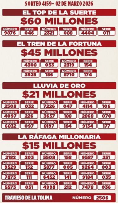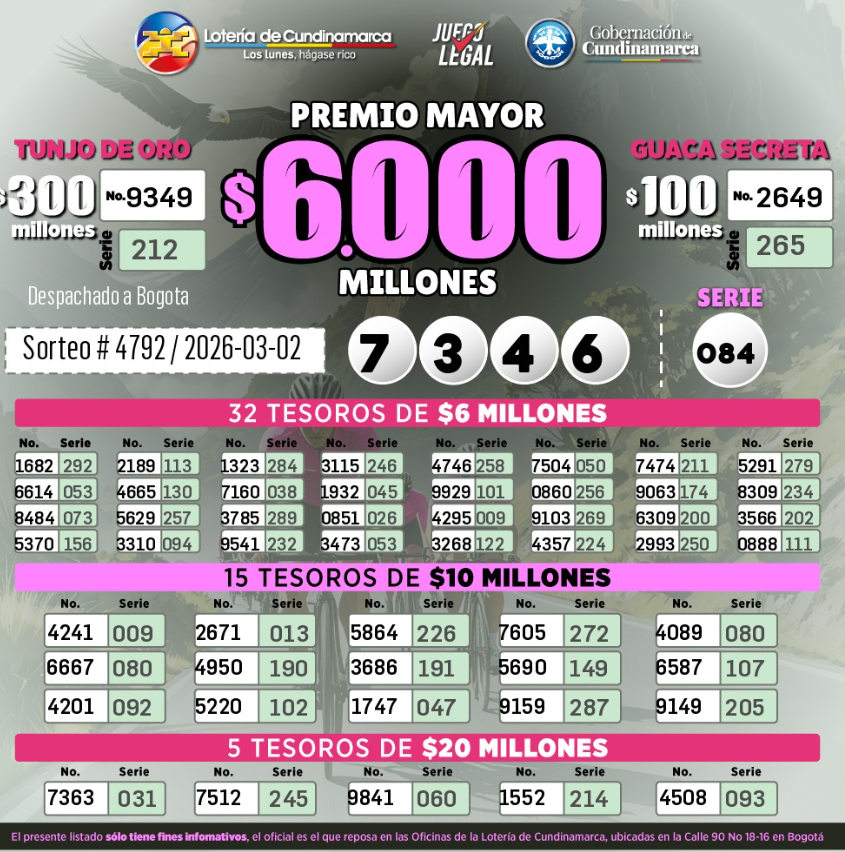 Resultados de las Loterías de Cundinamarca y Tolima: ¡Más de $9.500 millones en premios este lunes 2 de MARZO ! para los apostadores en Colombia.