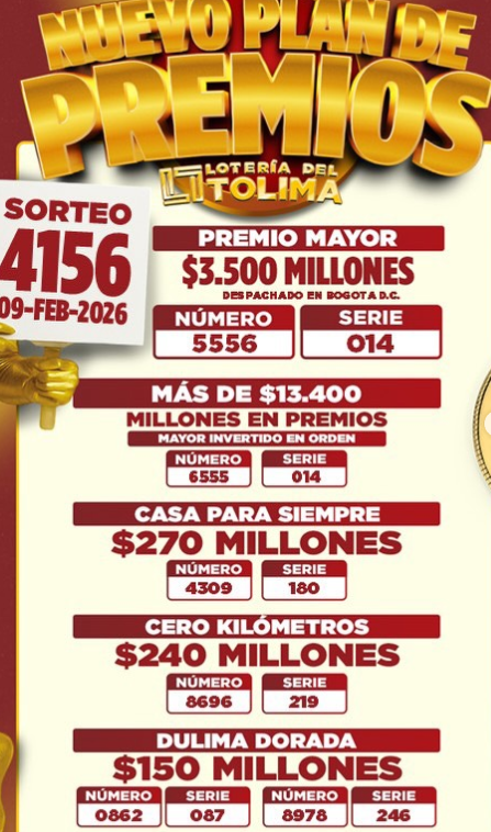 El premio mayor, de tres mil quinientos millones de pesos ($3.500.000.000), fue vendido en Bogotá, así que los capitalinos deben estar atentos. Tolima también sorteó 39 premios secos, incluyendo un bono de 270 millones para compra de vivienda y premios desde los 12 millones de pesos: