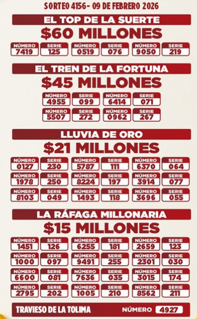 Resultados de las Loterías de Cundinamarca y Tolima: ¡Más de $9.500 millones en premios este lunes 9 de febrero! para los apostadores en Colombia.