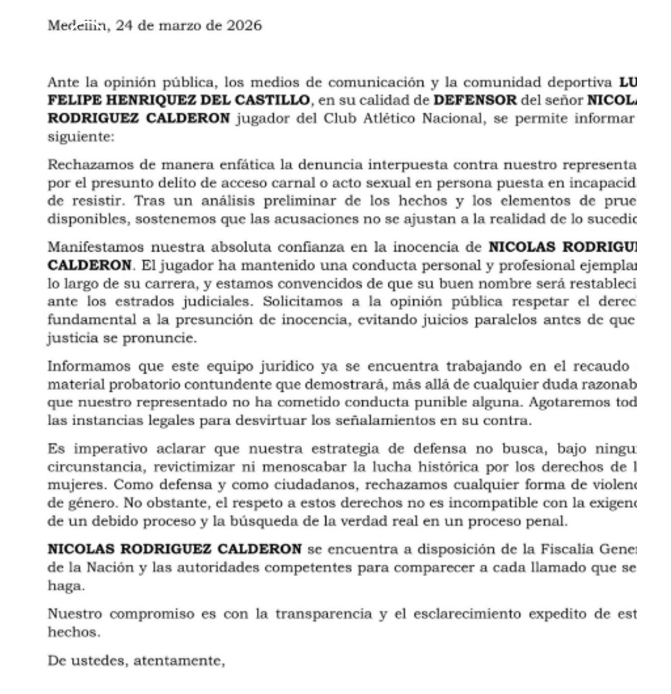 El caso queda en manos de las autoridades mientras que el Club Atlético Nacional retiró al jugador del plantel titular.