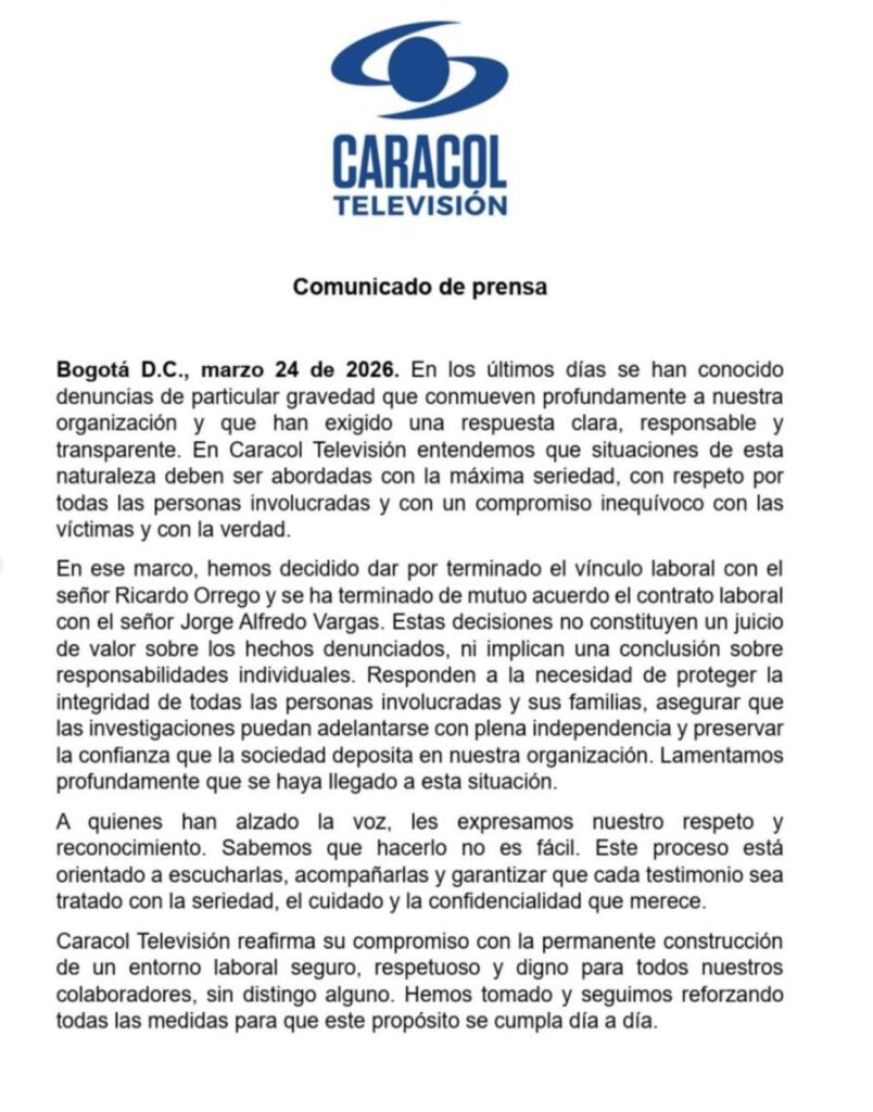 En un mensaje público de 4 párrafos Caracol Televisión confirmó que son Ricardo Orrego y Jorge Alfredo Vargas las personas involucradas en una denuncia de acoso sexual sistemático contra las periodistas del Canal y de su emisora Blu Radio.