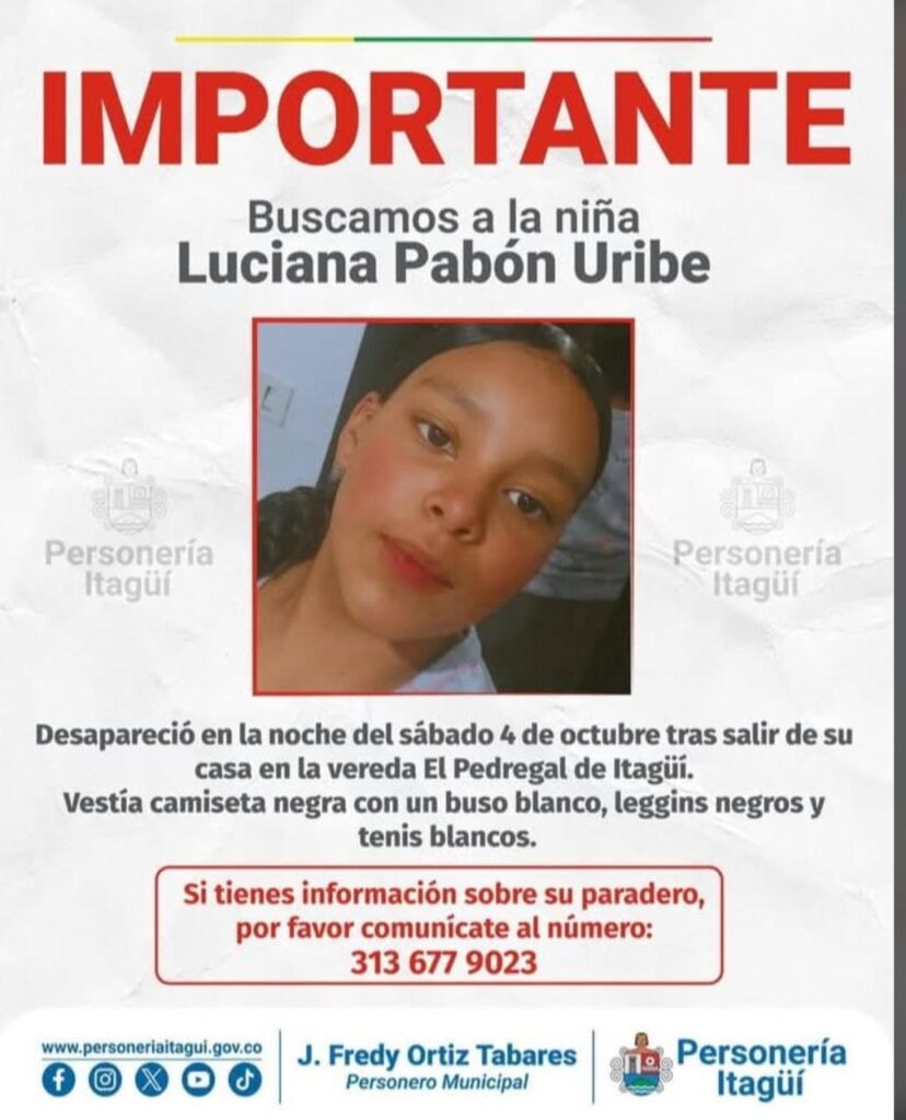La Policía Metropolitana y la Personería de Itagüí se unieron a la familia que, desesperadamente, inició la búsqueda de Luciana Pabón Uribe, la niña de 14 años que desapareció en ese municipio el sur del Valle de Aburrá.