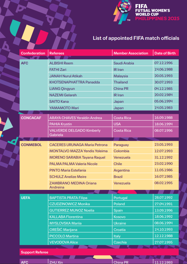 La Comisión de Árbitros de la FIFA ha anunciado la lista de árbitras que dirigirán los partidos de la edición inaugural de la Copa Mundial Femenina de Futsal de la FIFA™, que se disputará en Filipinas del 21 de noviembre al 7 de diciembre de este año.
